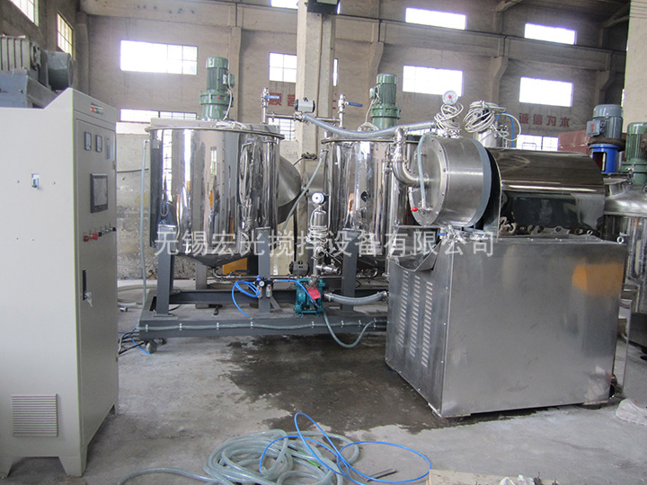 加料泵將預分散的材料送人研磨桶,研磨筒內裝有研磨介質,磨細后的物料經動態分離器排出,視產品細度不同,可采用單臺連續或多臺串聯連續研磨工藝。